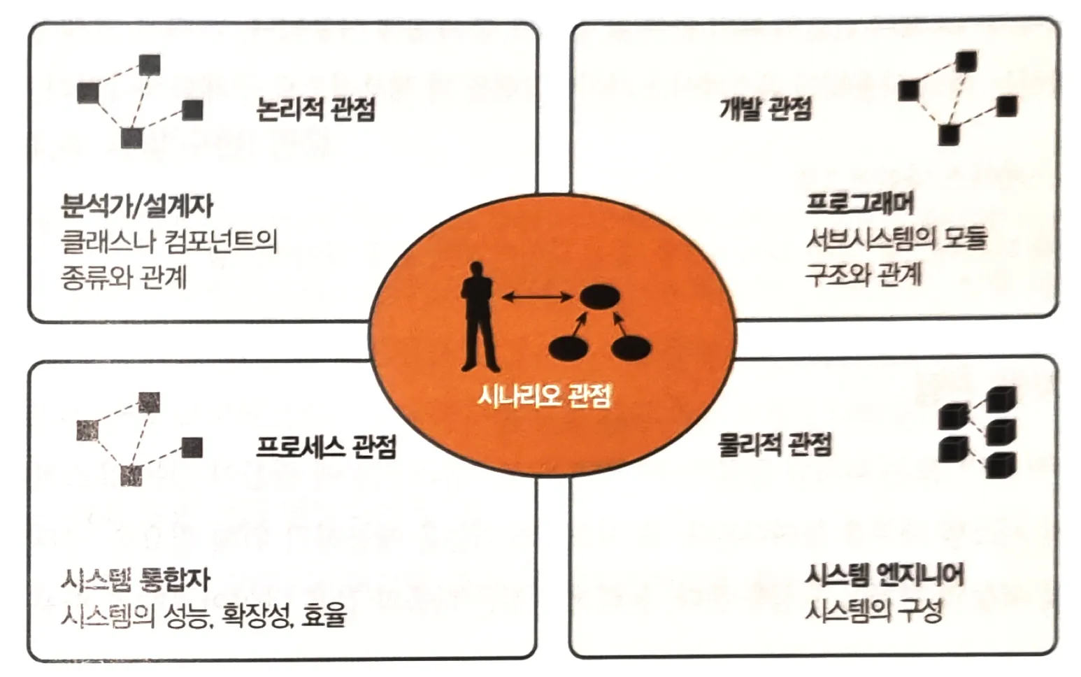 | 유스케이스 뷰 (Usecase View) | - 다른 뷰를 검증하는데 사용 - 사용자, 설계자, 개발자, 테스트 관점 | 유스케이스 다이어그램 |